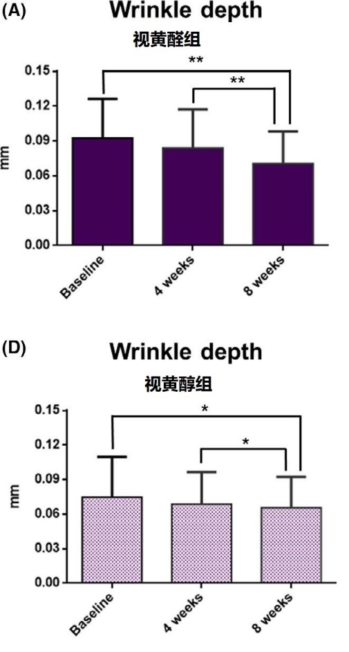 受試者的(de)魚尾紋深度用(yòng)Antera 3D相(xiàng)機(jī)測量,結果兩組的(de)深度均有(yǒu)減少(shǎo),其中視(shì)黃(huáng)醇半臉8周後減少(shǎo)10.27%,視(©shì)黃(huáng)醛半臉減少(shǎo)23.7%,差距有(yǒu)統計(jì)學意義(p = 0.001):