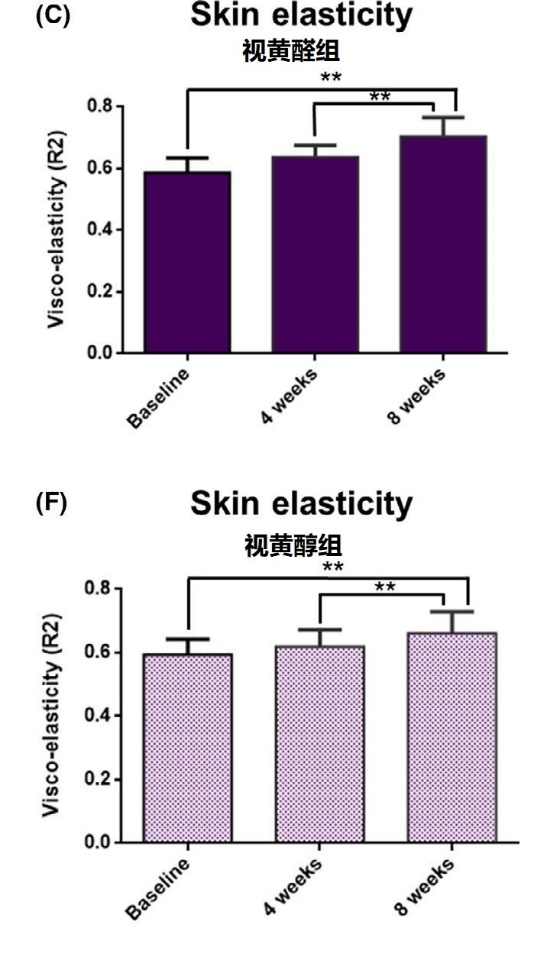 皮膚彈性用(yòng)Cutometer Dual MPA 580測量,結果兩組均有(yǒu)增加,其中視(shì)黃(huáng)醇半臉8周後增加11.86%,視(shì)黃 (huáng)醛半臉增加20.34%,差距有(yǒu)統計(jì)學意義(p < 0.001):