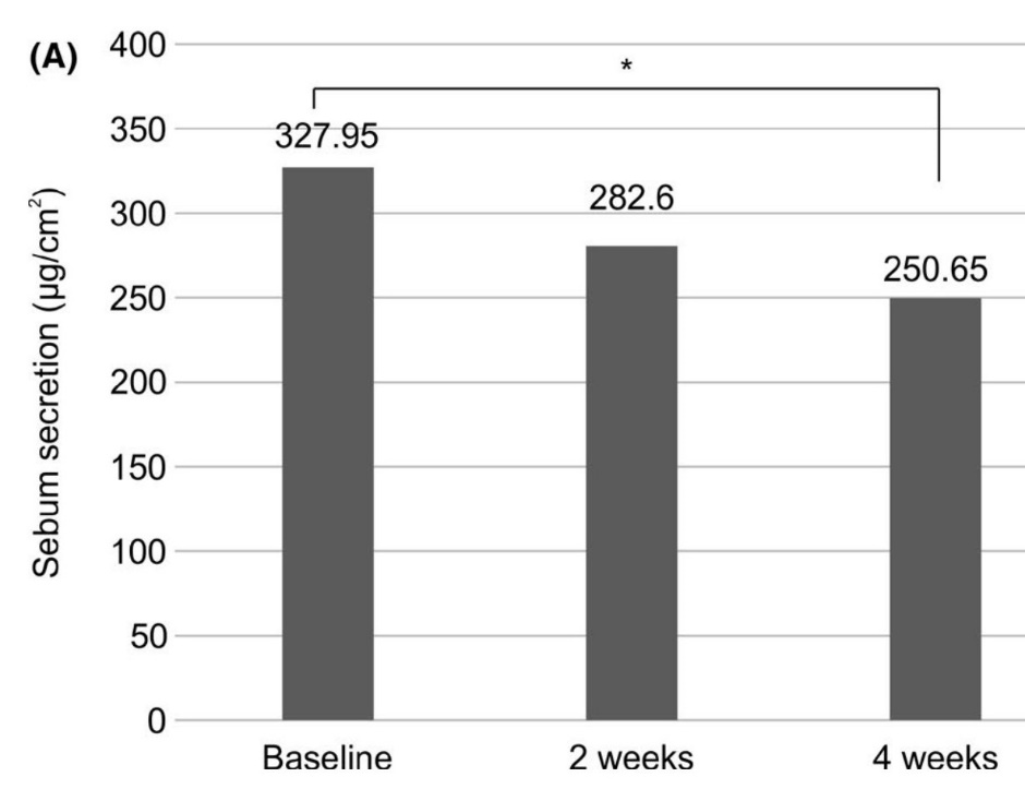 皮脂量用(yòng)Sebumeter SM 8155測量,4周後減少(shǎo)23.57%(p < 0.001):