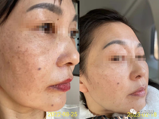 李女(nǚ)士,45歲,面部黃(huáng)褐斑,2022-08-25初診。根據黃(huáng)褐斑的(de)發病原因,予口服藥、外(wài)用(yòng)藥治療的(de)同時(shí),搭配閱膚的(de)煥膚精華素、皮膚屏障修護霜及物(wù)理(lǐ)BB防曬霜輔助。兩個(gè)月(yuè)後複診,面部黃(huáng)褐斑色沉變淡。
